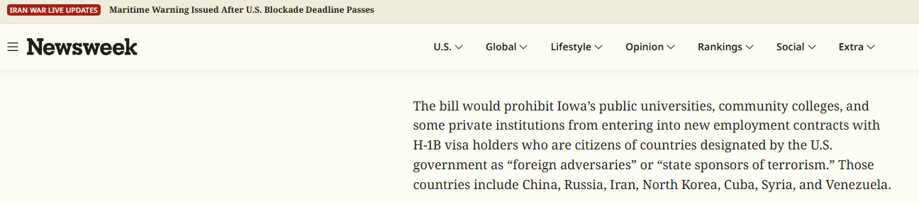 一项编号为HF 2513的法案正以超出预期的速度推进。该法案明确禁止爱荷华州公立高校与来自特定国家的外籍人才签订新的H-1B雇佣合同。这意味着,爱荷华州正逐步成为全美又一个对H-1B高校通道施加限制的州。