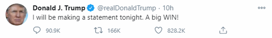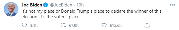 两位候选人在社交媒体的唇枪舌战则让事态更加混乱:特朗普先发了一条推特,直指大选计票存在舞弊行为,并“任性”宣布,他已经赢了,“我将在今晚发表一个重要讲话。赢得漂亮!”其团队则声称在多州发起诉讼,要求停止或重新计票。而拜登则发推打脸特朗普,“无论是我或者是特朗普,都还没到可以宣称胜利的时候。仍然要看选民!”