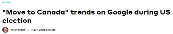 在选情依然胶着、大选结果依然悬而未决的情况下,一个令人玩味的现象再度卷土重来,那就是搜索“如何移居加拿大”的热度在持续升温。据谷歌趋势数据显示,截至美东时间11月3日晚10点,美国用户对“如何移居加拿大”的搜索量比2日同一时间至少增长了700%。