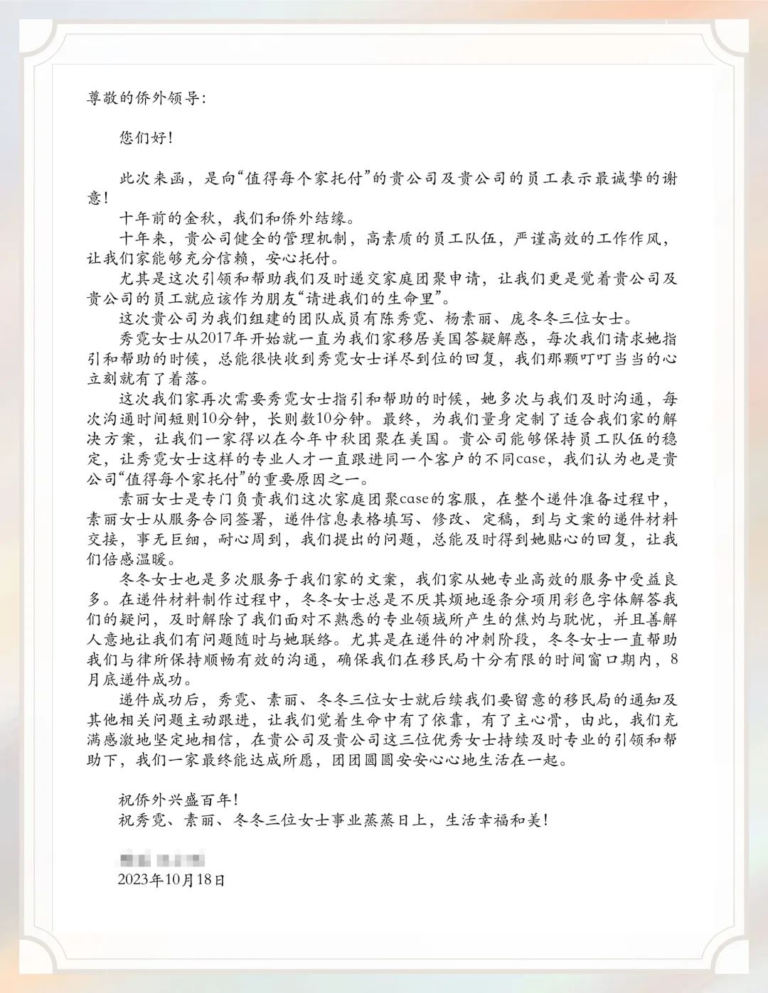 今年是侨外做EB5的第20年。用多位十年老客户的话说,我们有健全的管理机制,高素质的员工队伍,严谨高效的工作作风,值得每个家信赖。侨外也会继续用专业,认真,严谨的态度为客户保驾护航!