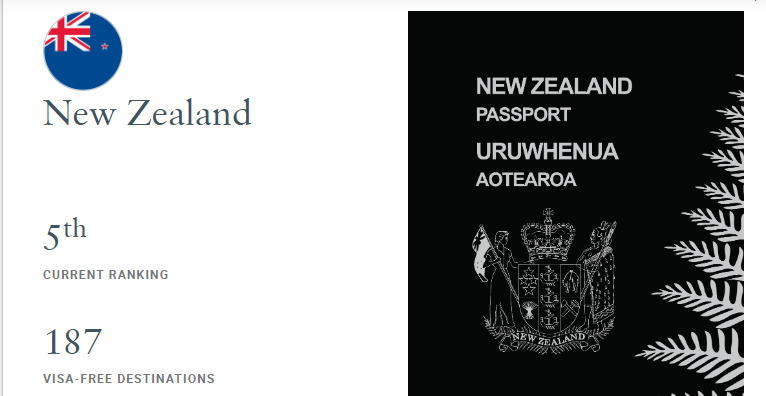 另外,如果你拿到了新西兰护照,还能“说走就走”。在2025年最新版全球护照实力排名(The Henley Passport Index)中,新西兰的“小黑本”排名第五,持该国护照可自由进入全球187个旅行目的地。