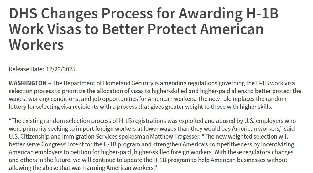 2025年12月23日,美国移民局正式宣布:H-1B签证将取消随机抽签机制,全面采用基于薪资水平的加权排序制度。新规将于2026年2月27日生效,适用于2027财年及以后的申请。