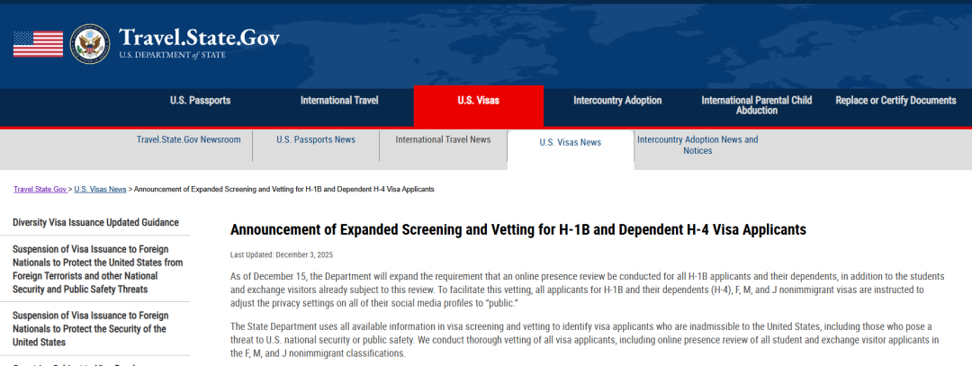 2025年12月3日,美国国务院宣布,自12月15日起,将对H-1B工签的主申请人及其持H-4签证的配偶的社交媒体账号进行审查。
