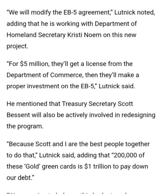 卢特尼克表示,现有的EB-5计划已经实施了多年,然而,许多此类项目存在问题,而且往往不成功。 “我们将修改(modify)EB-5协议,”卢特尼克指出,并补充说,他正在与国土安全部长克里斯蒂·诺姆合作推进这一新项目。