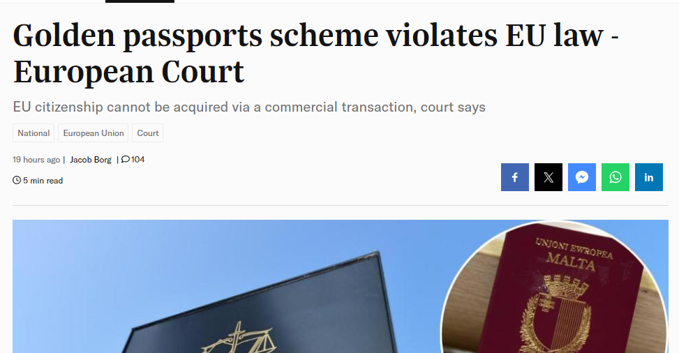当地时间4月29日,欧洲法院作出历史性判决,认定马耳他政府实施的投资入籍计划(IIP)违反欧盟法律基本原则,要求马耳他关停该计划。