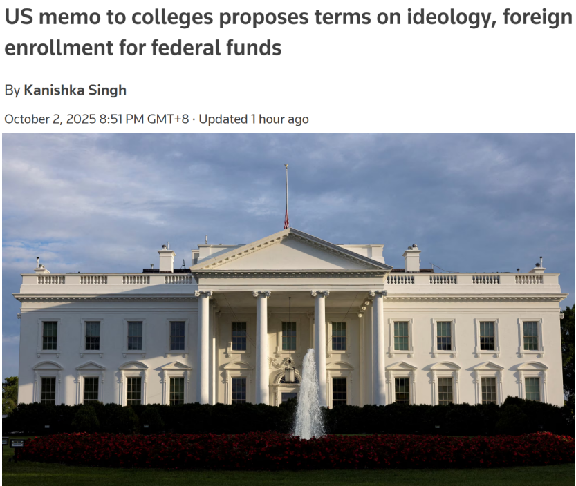 10月1日,特朗普政府毫无预兆地向美国多所顶尖高校下发了一份备忘录,其中包含一份名为《高等教育学术卓越契约》(Compact for Academic Excellence in Higher Education)的协议文件。