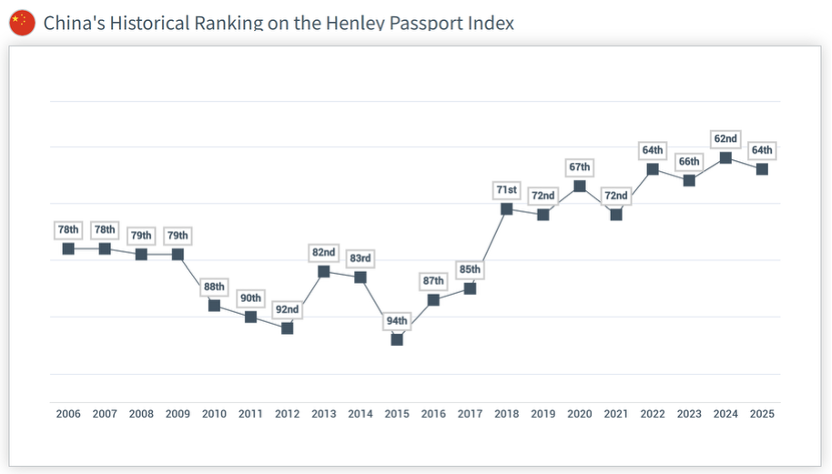 中国护照在近十年里总体呈现“稳中有升”的趋势,尤其在与中东、拉美、非洲等国签证便利化上取得进展——但与最强护照相比仍有差距。今年的排名也有轻微下跌,排名第64位。