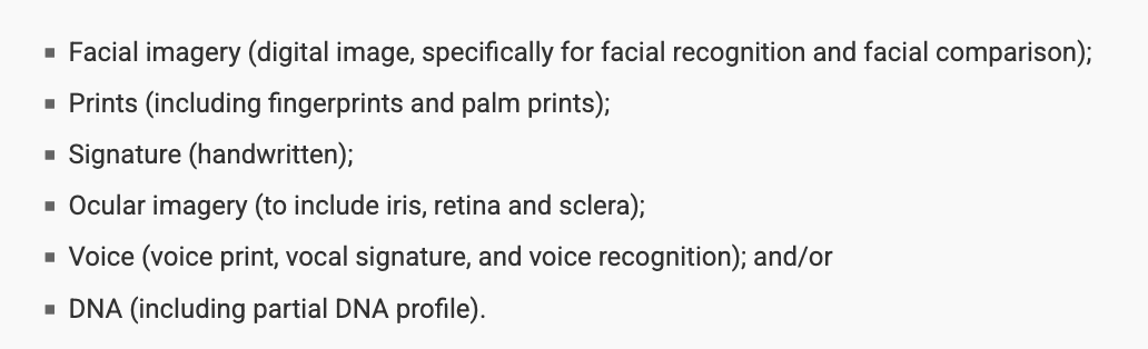根据该提案,“生物识别信息”的采集范围将大幅扩展,具体包括指纹、掌纹、面部图像、声纹、手写签名、虹膜/视网膜/巩膜等眼部图像,并进一步涵盖DNA样本或部分DNA图谱。
