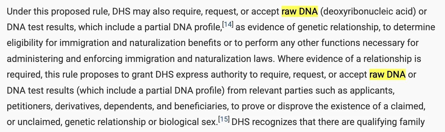 值得关注的是,DNA检测被正式列为常规采集内容。提案指出,DHS有权要求并接收原始DNA样本或检测结果,作为判定亲属关系的依据,用于评估移民及入籍资格,或用于执行与移民和国籍法律相关的其他职能。