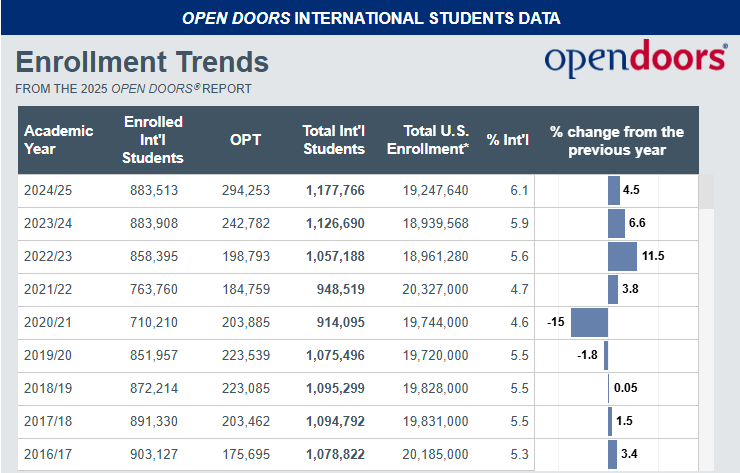 根据2025年度《门户开放》报告,2024/2025学年在美国各类高校就读的国际学生总数达到1,177,766人,同比增长4.5%,实现了自疫情以来的连续第四年增长。