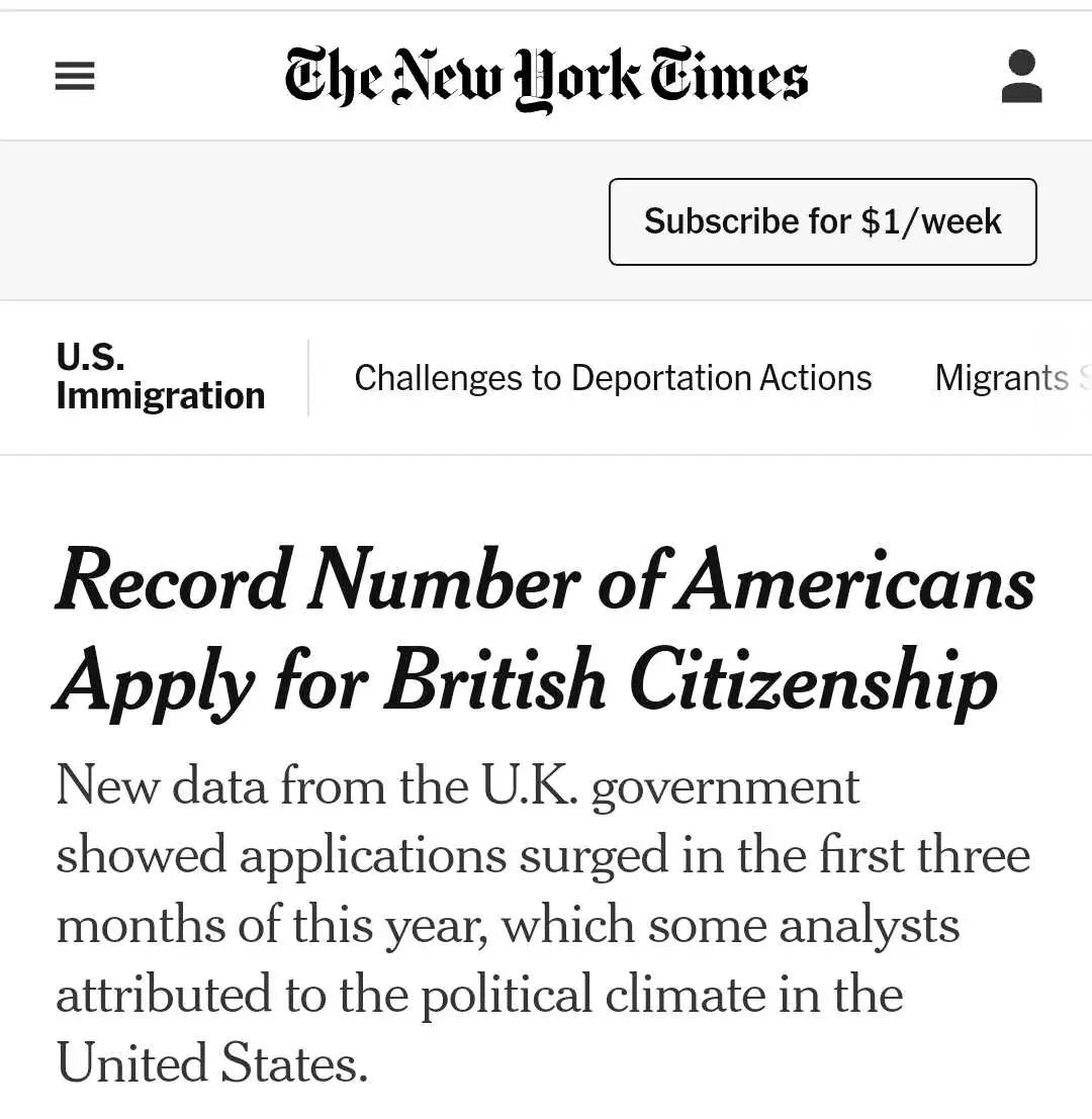 近日,英国政府公布了一组令人瞠目结舌的数据:在截至今年3月的一年中,申请英国公民身份的美国人数飙升至6600人,同比暴涨30%,创下历史最高纪录!这股热潮让移民专家都直呼"始料未及"。