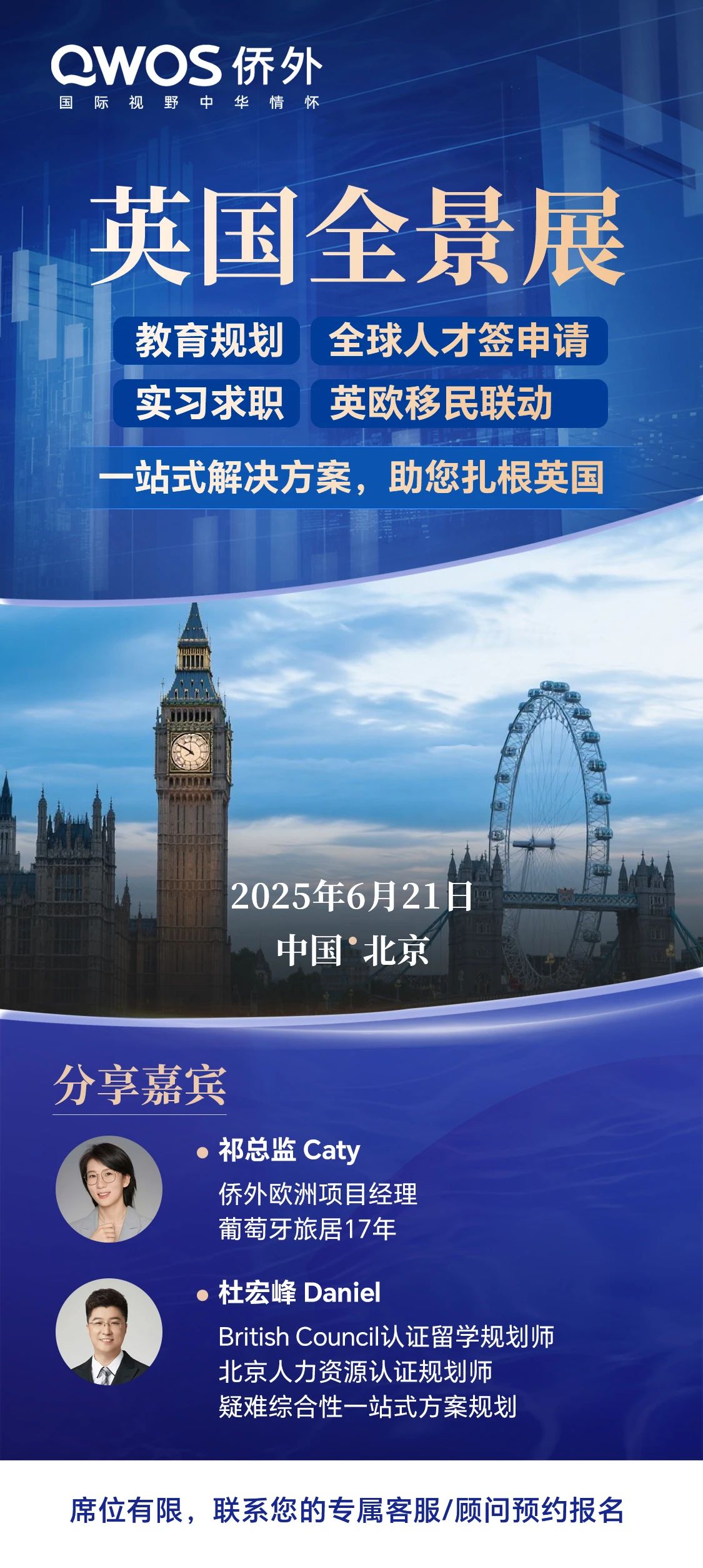 感兴趣的朋友,也欢迎参加侨外出国6月21日举办的“英国全景展”,活动将聚焦教育规划、实习求职、全球人才签申请、欧洲移民四大方向,提供全攻略解析,助你稳扎英国!