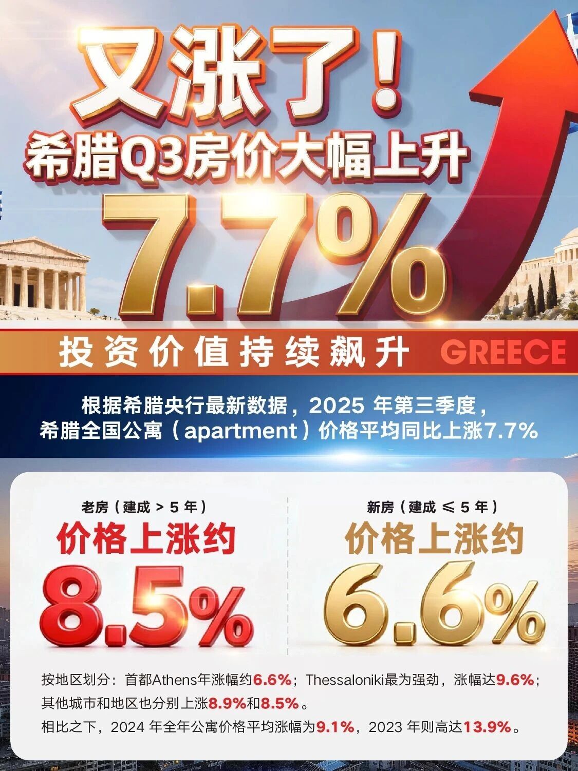 根据希腊央行最新数据,2025年第三季度全国公寓均价同比上涨7.7%,增幅稳健。其中,老旧公寓(房龄超5年)因稀缺性,价格涨幅达8.5%,高于新建公寓的6.6%。