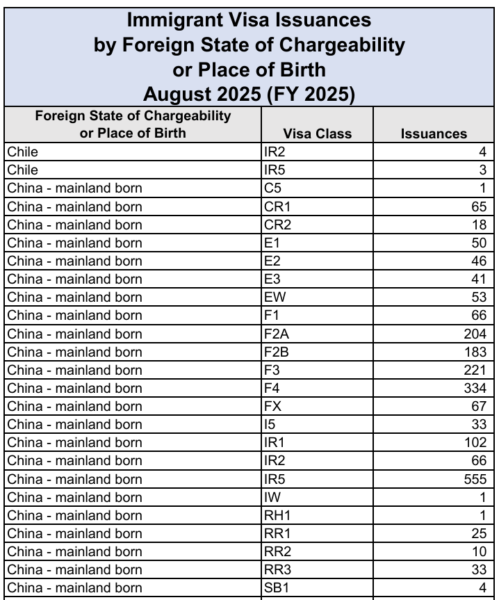 全球各地中国出生的申请人,6月份在E1类别(职业类移民EB-1)上共获得了52张移民签证,7月份62张,8月份50张,远低于财年初(10月817张、11月442张)的水平,符合财年末签证发放的常规节奏。