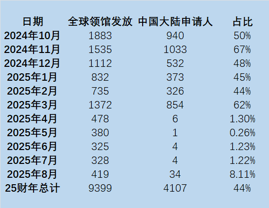 不过,在新政下,中国申请人仍是最大受益群体。虽然6月仅有17人获得签证,占比30.9%,但7月迅速放量至142人,占当月全球发放量的74.7%,8月虽回落至69人,占比仍维持在74.2%的高位。