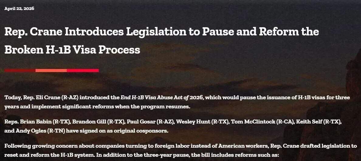 当地时间 4 月 22 日,美国亚利桑那州共和党众议员伊莱・克兰(Eli Crane)联合7名众议院共和党同僚,正式向国会提交了《2026 年终结H-1B签证滥用法案》(End H-1B Visa Abuse Act of 2026)。